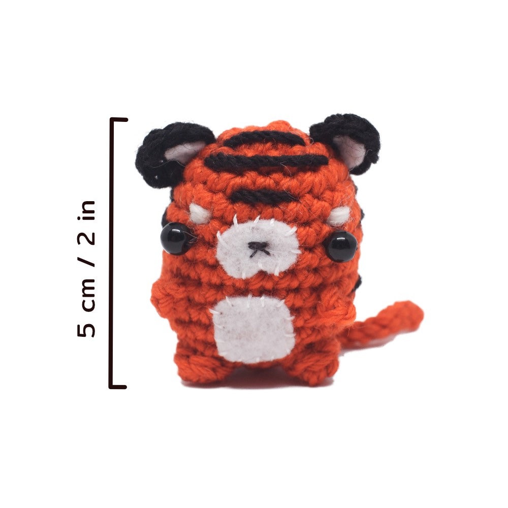 Using medium (worsted) weight yarn and a 3.5mm (E) crochet hook, your tiger will be about 5 cm (2 in) tall and 4 cm (1.6 in) wide. However, exact gauge is not important for this project, and you can adjust the size by using thicker or thinner yarn.