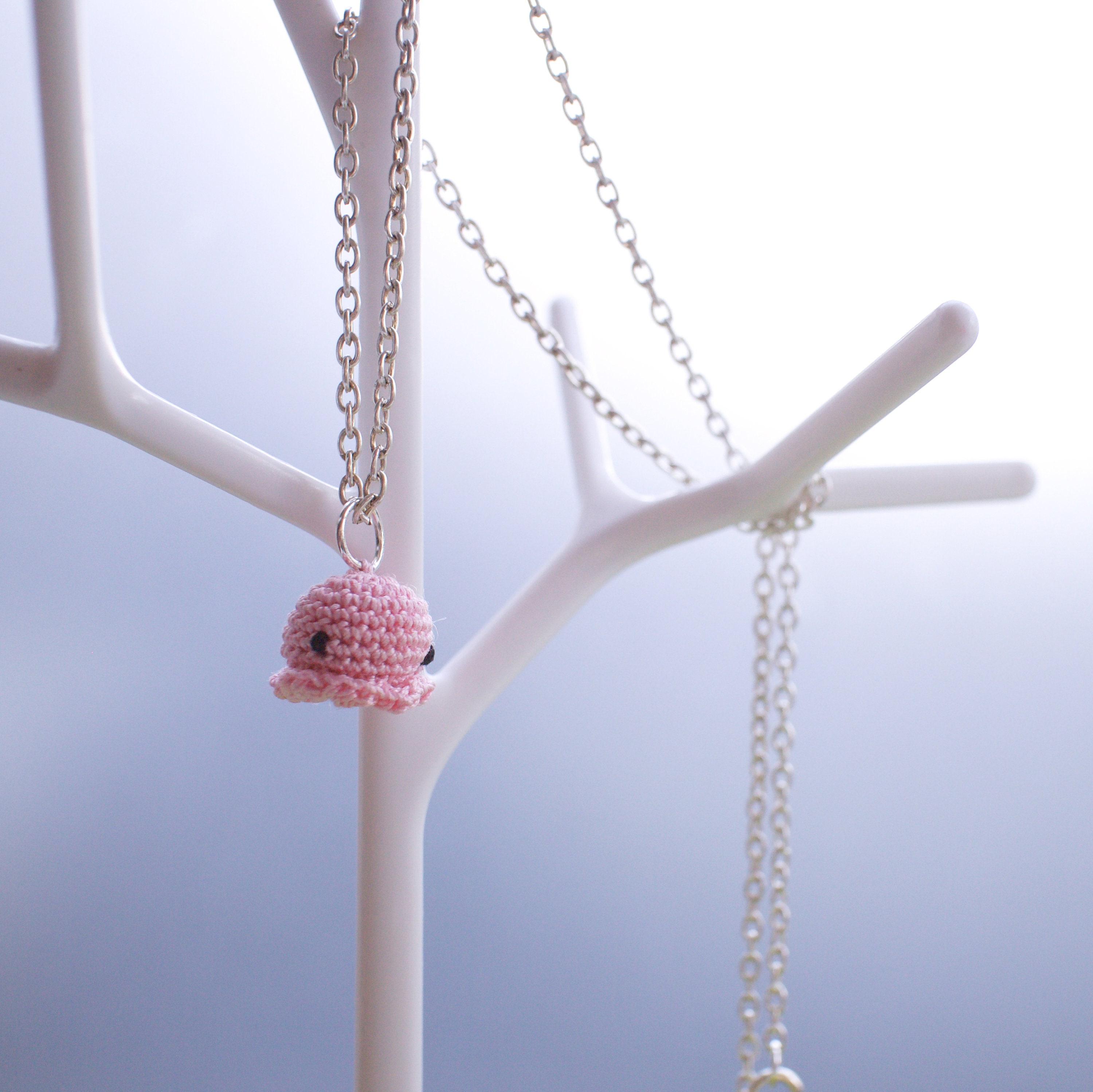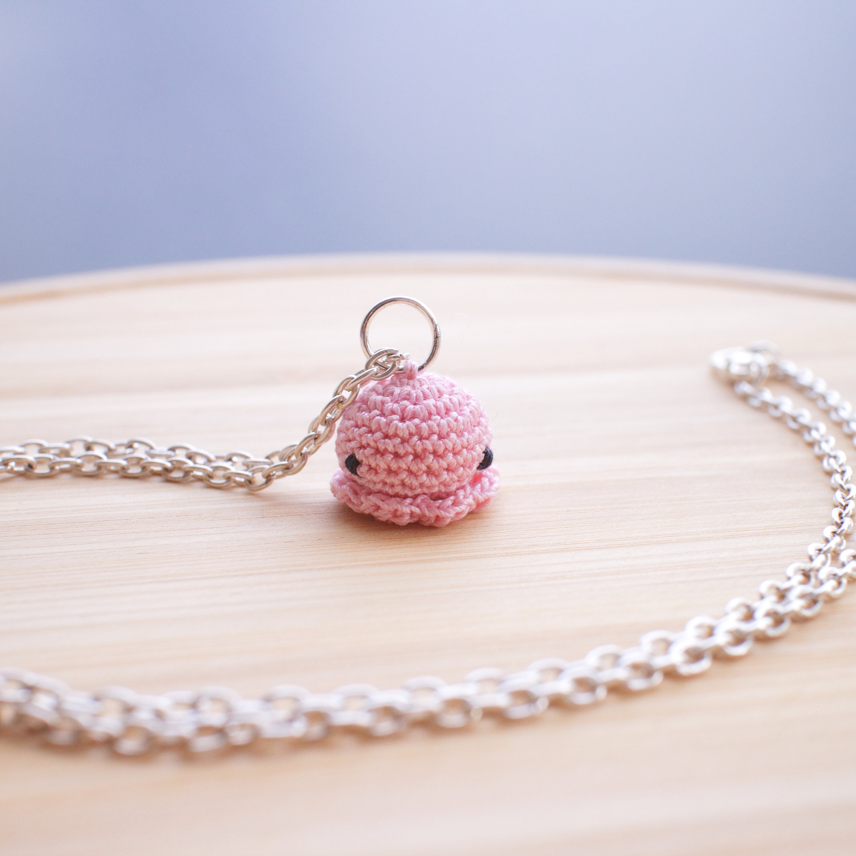 Add a cute pastel accent to your outfit with this handmade necklace, featuring an adorable miniature amigurumi octopus in a light pastel pink colour.
