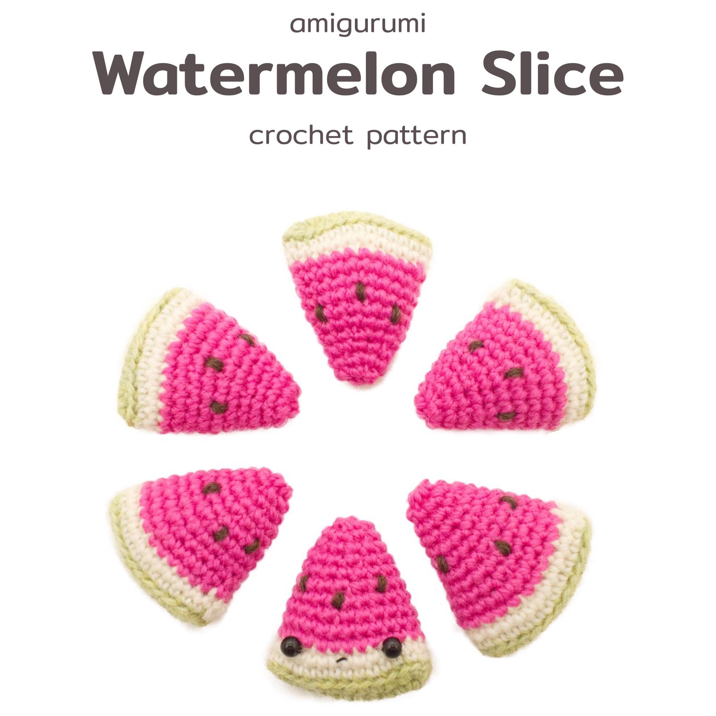 The pdf file includes a written crochet watermelon slice pattern (US crochet terms) with lots of photos, and assembly instructions. A printer-friendly version with fewer photos is included.
