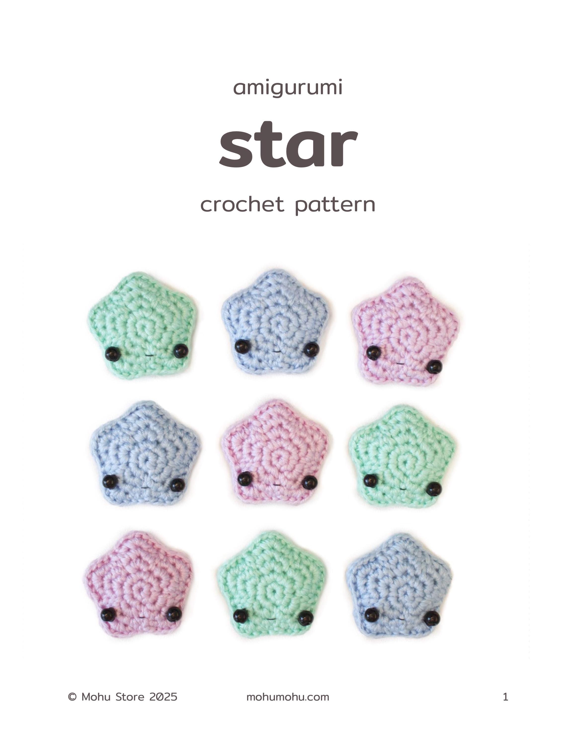 The pdf file includes a written crochet star pattern (US crochet terms), step-by-step photos, and assembly instructions. A printer-friendly version with fewer photos is included.